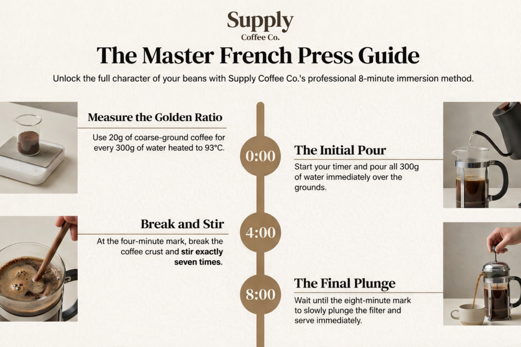 Eight minutes of stillness allows the bean to unfold completely. No rush. No shortcuts. Just patient extraction that reveals body, sweetness, and depth in equal measure.