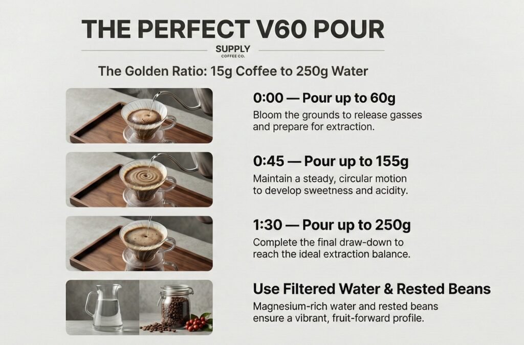 Filtered water, rested beans, and a precise bloom set the foundation for balanced extraction and expressive flavor.